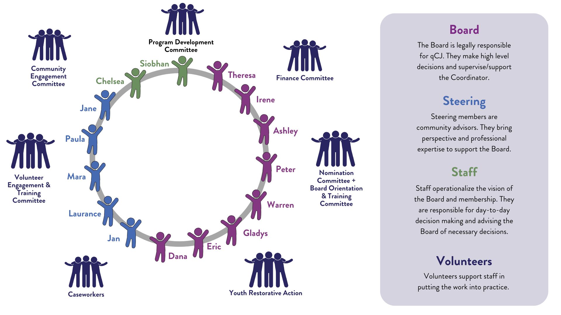 qathet Community Justice is powered by volunteers. We are constantly evolving, with foundational roots in Texada Island Restorative Justice, Powell River Diversity Initiative (PRDI), and a variety of other groups. Members of qCJ have been providing these services in a variety of capacities for over 15 years. Our trained volunteers include mediators, counsellors, businesspeople, artists, teachers, farmers, people from all walks of life. We have about 40 regular volunteers, 5-10 working groups, and numerous Case Teams. We rely heavily on community partnerships to support this core team.